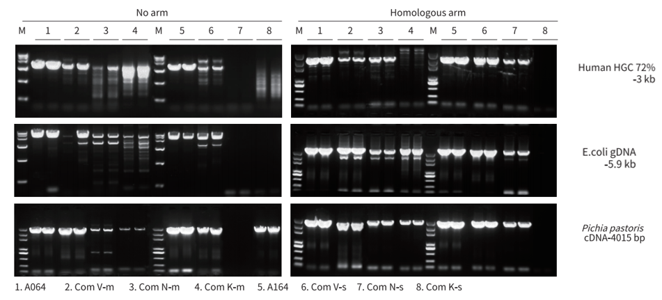 分別以人、小鼠、小麥、E.coli gDNA 為模板,使用 A064/A164、Com V、Com N、Com K 進(jìn)行不同長(zhǎng)度片段擴(kuò)增。結(jié)果顯示,A064/A164 對(duì)不同種屬來(lái)源不同長(zhǎng)度的 gDNA 片段兼容性強(qiáng),均能良好擴(kuò)增,且優(yōu)于 Com V、Com N 和 Com K