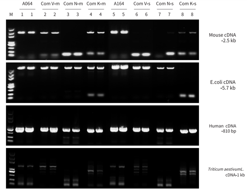 分別以人、小鼠、E.coli cDNA 為模板,使用 A064/A164、Com V、Com N、Com K 進(jìn)行不同長(zhǎng)度片段擴(kuò)增。結(jié)果顯示,A064/A164 對(duì)不同種屬來(lái)源不同長(zhǎng)度的 cDNA 片段兼容性強(qiáng),均能良好擴(kuò)增