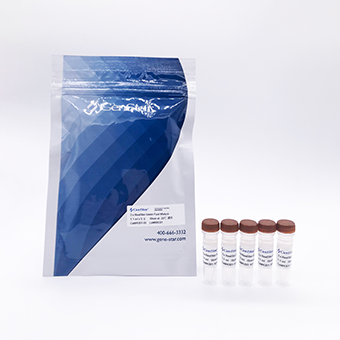 本產(chǎn)品是采用 SYBR Green I 嵌合熒光法進行實時熒光定量 PCR 的專用 2× 濃度預混液。本產(chǎn)品含有優(yōu)化濃度的 GenStar Fast HSTaq DNA Polymerase、SYBR Green I、dNTPs、Mg2+、反應緩沖液和穩(wěn)定劑等成分。主要用于基因組 DNA 靶序列和 RNA 反轉錄后 cDNA 靶序列的檢測。GenStar Fast HSTaq DNA Polymerase 高溫加熱前,抗 Taq 單克隆抗體與 Taq 結合, 抑制 Taq 的聚合酶活性,從而抑制在低溫條件下出現(xiàn)的由引物和模板 DNA 非特異性雜交或引物二聚體引起的非特異性擴增。 抗體在 PCR 反應的預變性步驟中已完全失活,不會阻礙之后 Taq 酶聚合反應,大大提高了 PCR 反應的靈敏度及特異性。 優(yōu)化濃度的 SYBR Green I 熒光染料摻入 DNA 雙鏈后,熒光信號增強,而不摻入鏈中 SYBR Green I 染料分子熒光信號不變, 從而保證熒光信號的增加與 PCR 產(chǎn)物的增加完全同步,熒光可以在退火或延伸階段測定。