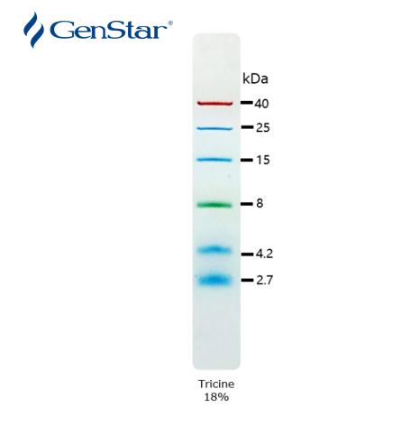 本產(chǎn)品包含了 2.7-40 kDa 的 6 種高度純化并預(yù)染的重組蛋白質(zhì)。6 種條帶分別為:2.7、4.2、8、15、25、40 kDa。其中 8 kDa 條帶為綠色預(yù)染條帶,40 kDa 條帶為橙紅色預(yù)染條帶,方便判斷各個(gè)條帶準(zhǔn)確位置。