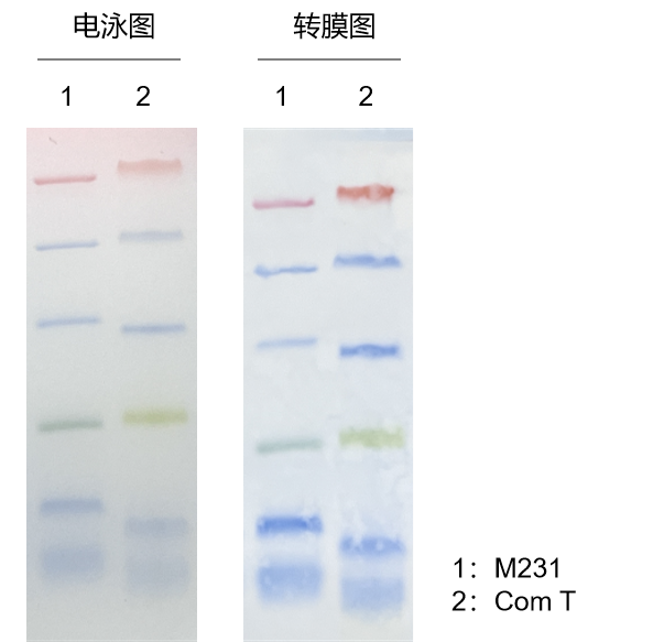 本產(chǎn)品包裝便利,為即用型產(chǎn)品,請(qǐng)勿加熱、稀釋或添加還原劑。使用本產(chǎn)品可動(dòng)態(tài)觀察蛋白電泳狀態(tài)和轉(zhuǎn)膜效果。經(jīng)SDS-PAGE 電泳后轉(zhuǎn)移到 PVDF 膜、NC 膜上可見清晰的彩色條帶。預(yù)染蛋白與染料結(jié)合后,在不同緩沖體系中,位置會(huì)有遷移,本產(chǎn)品在用于判斷目的蛋白分子量大小時(shí)僅供參考。