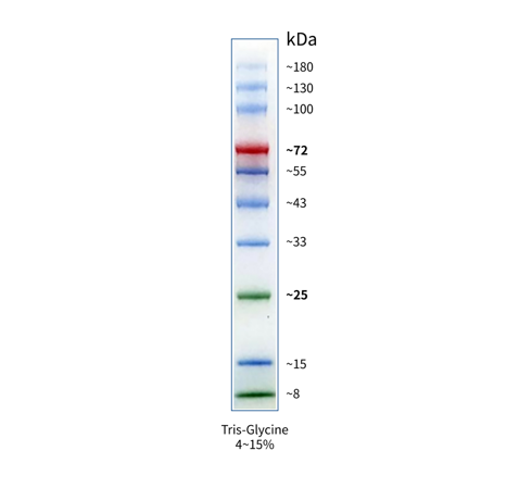 本產(chǎn)品包含了 8-180 kDa 的 10 種高度純化預染的重組蛋白質(zhì)。10 種條帶分別為:8、15、25、33、43、55、72、100、130、180 kDa。其 8 kDa 和 25 kDa 條帶為綠色預染條帶,72 kDa 條帶為橙紅色預染條帶,方便判斷各個條帶準確位置。 本產(chǎn)品包裝便利,為即用型產(chǎn)品,請勿加熱、稀釋或添加還原劑。使用本產(chǎn)品可動態(tài)觀察蛋白電泳狀態(tài)和轉(zhuǎn)膜效果。經(jīng) SDS-PAGE 電泳后轉(zhuǎn)移到 PVDF 膜、NC 膜上可見清晰的彩色條帶。預染蛋白與染料結(jié)合后,在不同緩沖體系中,位置會有遷移,本產(chǎn)品在用于判斷目的蛋白分子量大小時僅供參考。