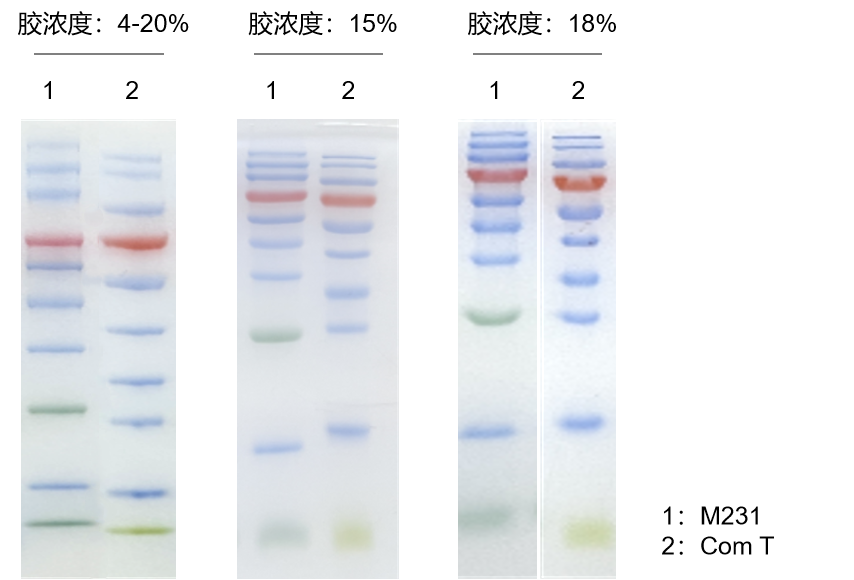 分別使用GenStar #M231、Com T 在不同濃度凝膠中進行電泳測試,上樣量 5 μl、電壓 200V、電泳 45 min。結(jié)果顯示,GenStar #M231 電泳條帶清晰,電泳遷移率和小條帶清晰度與 Com T 有差異,效果與 Com T 相當。