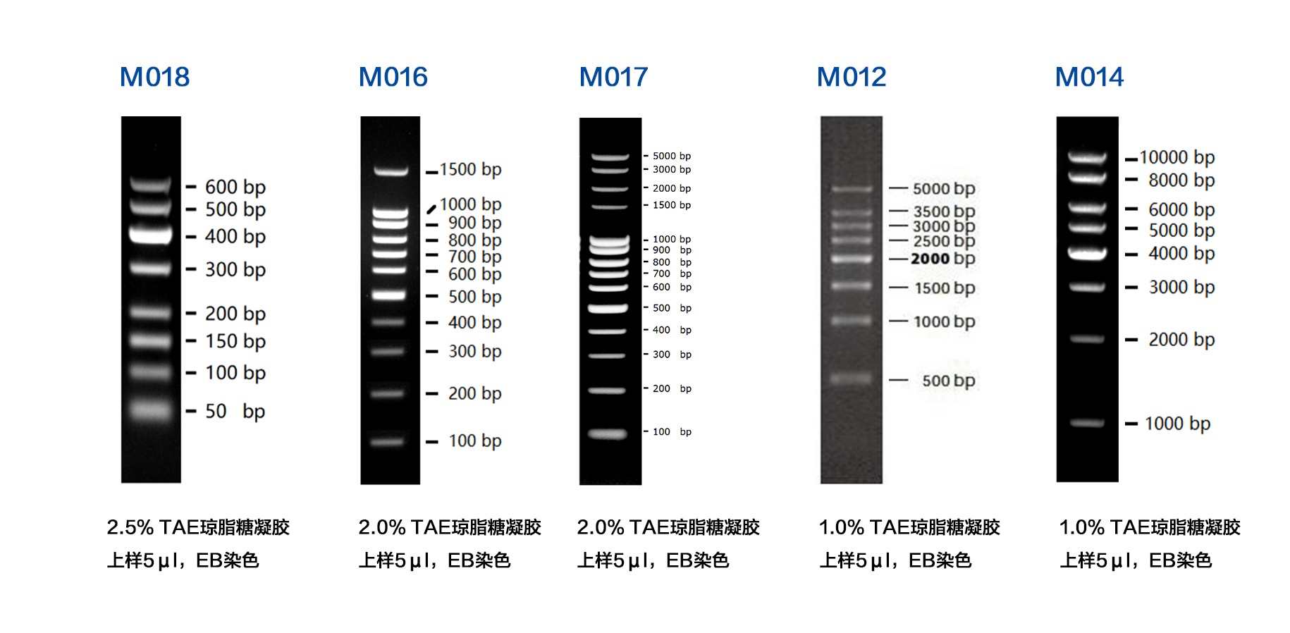 本產(chǎn)品為預(yù)混有 1x 上樣緩沖液的即用型 DNA 分子量標(biāo)準(zhǔn),由 11 條線狀雙鏈 DNA 條帶組成,適用于對(duì) 100 bp 至 1 .5 kb 的雙鏈 DNA 分子大小的估算和粗略定量。本產(chǎn)品的 11 條帶分別為 100、200、300、400、500、600、700、800、900、1000 和 1500 bp,上樣 5 ul 時(shí)各條帶的 DNA 含量分別為 50 ng、40 ng、30 ng、40 ng、100 ng、60 ng、70 ng、80 ng、90 ng、100 ng、50 ng。
