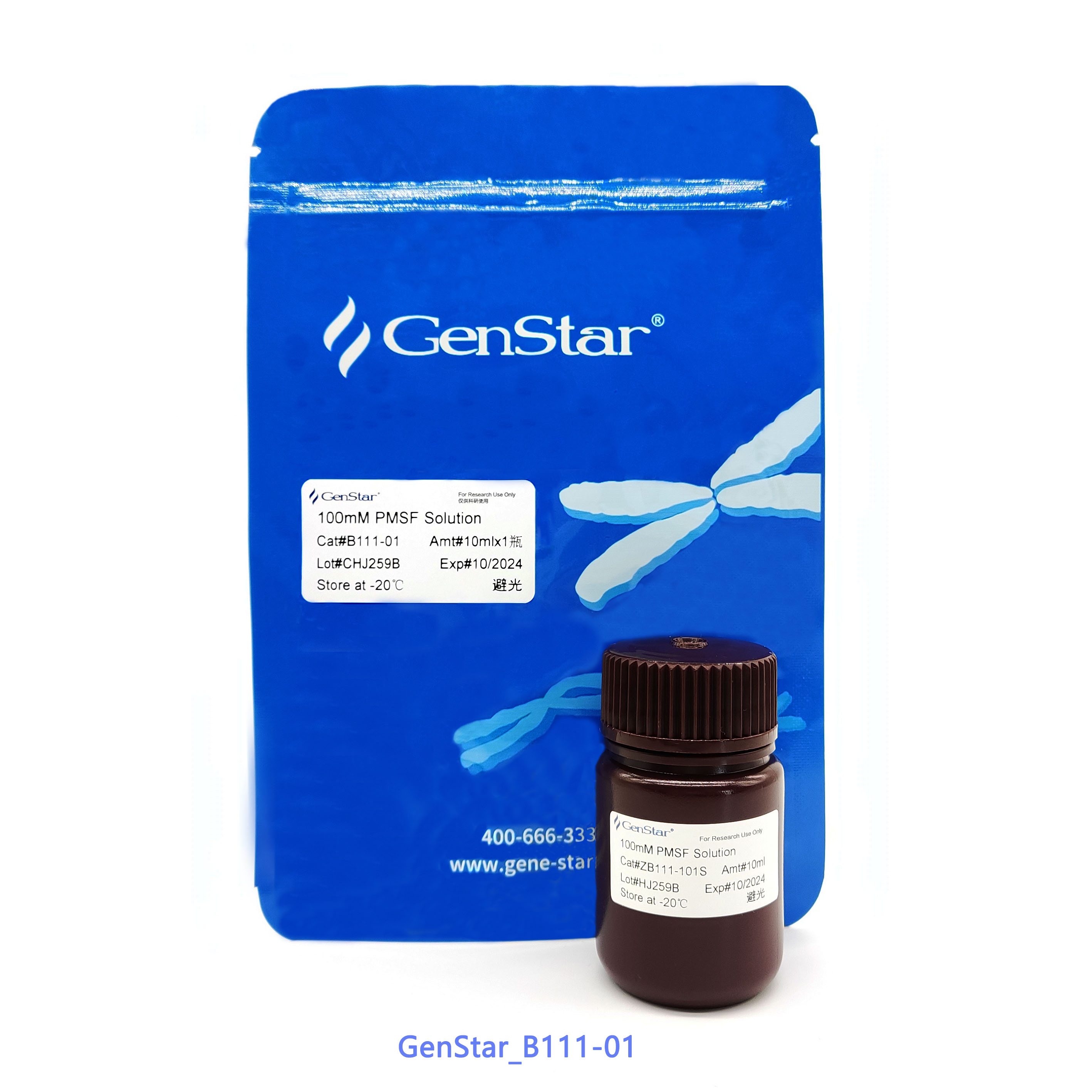 PMSF(苯甲基磺酰氟)可抑制絲氨酸蛋白酶磺化的絲氨酸殘基的活性部位,是絲氨酸蛋白酶(如胰蛋白酶,胰凝乳蛋白酶,凝血酶)和巰基蛋白酶(如木瓜蛋白酶)等酶的不可逆非特異性抑制劑。但不抑制金屬蛋白酶、大多數(shù)的半胱氨酸蛋白酶或天冬氨酸蛋白酶。故 PMSF 通常用于制備細(xì)胞裂解液,有助于保護(hù)樣品免受蛋白酶及其他酶的消化功能的影響。PMSF 也可用于在進(jìn)行 Western blotting 之前從組織和細(xì)胞中制備蛋白質(zhì)提取物。 本產(chǎn)品為 100 mM 的儲存液,溶劑為異丙醇。通常,1 mM 最終濃度能提供足夠的蛋白酶保護(hù)。使用時建議按照 1:100 添加至 RIPA 裂解液系列產(chǎn)品(GenStar#E121、E122、E123)、NP-40 裂解液(GenStar#E124)、Western 及免疫沉淀用細(xì)胞裂解液(GenStar#E125)。