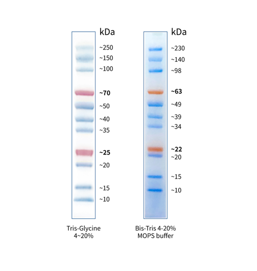 本產(chǎn)品由跨度從 10-250 kDa 的 11 種高度純化的橙色、藍(lán)色預(yù)染蛋白質(zhì)組成。其中 25 kDa 條帶和 70 kDa 條帶為橙紅色預(yù)染條帶。本產(chǎn)品適合作為 SDS-PAGE 電泳時(shí),變性蛋白樣品的分子量參照,并可實(shí)時(shí)觀察蛋白樣品的電泳分離狀況,也可用于檢測(cè) Western blot 的轉(zhuǎn)膜效率。由于共價(jià)結(jié)合的染料會(huì)影響蛋白質(zhì)分子的電泳遷移率,本產(chǎn)品僅適于粗略地估計(jì)目的蛋白樣品的分子量。