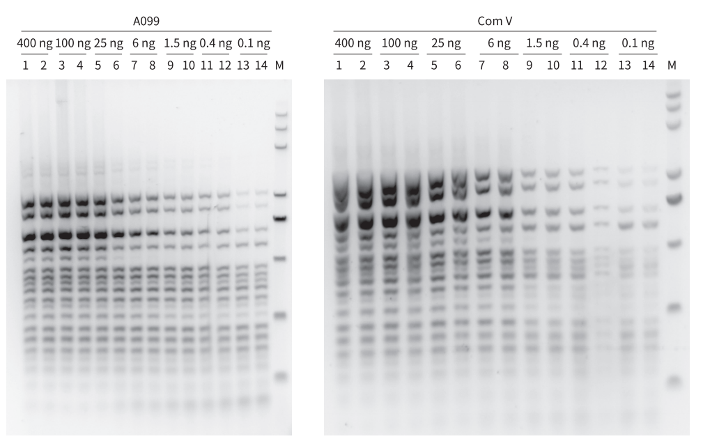 以 Human 基因組為模板,同時擴增 19 個目的片段。結果顯示,A099 最低檢測限可達 0.1 ng,不會出現條帶丟失且條帶清晰優于 Com V
