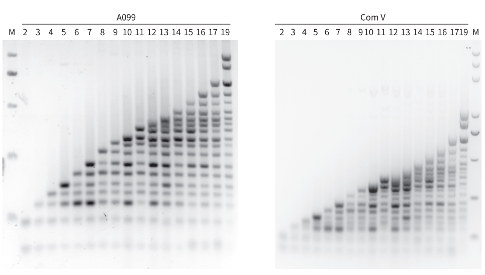 以 Human 基因組為模板,擴增 2~19 重目的片段(50-1028 bp)。結果顯示,所有目的片段都清晰可見,A099 可在同一反應中擴增多達 19 個目的片段,且擴增效率和條帶清晰度均優于 Com V