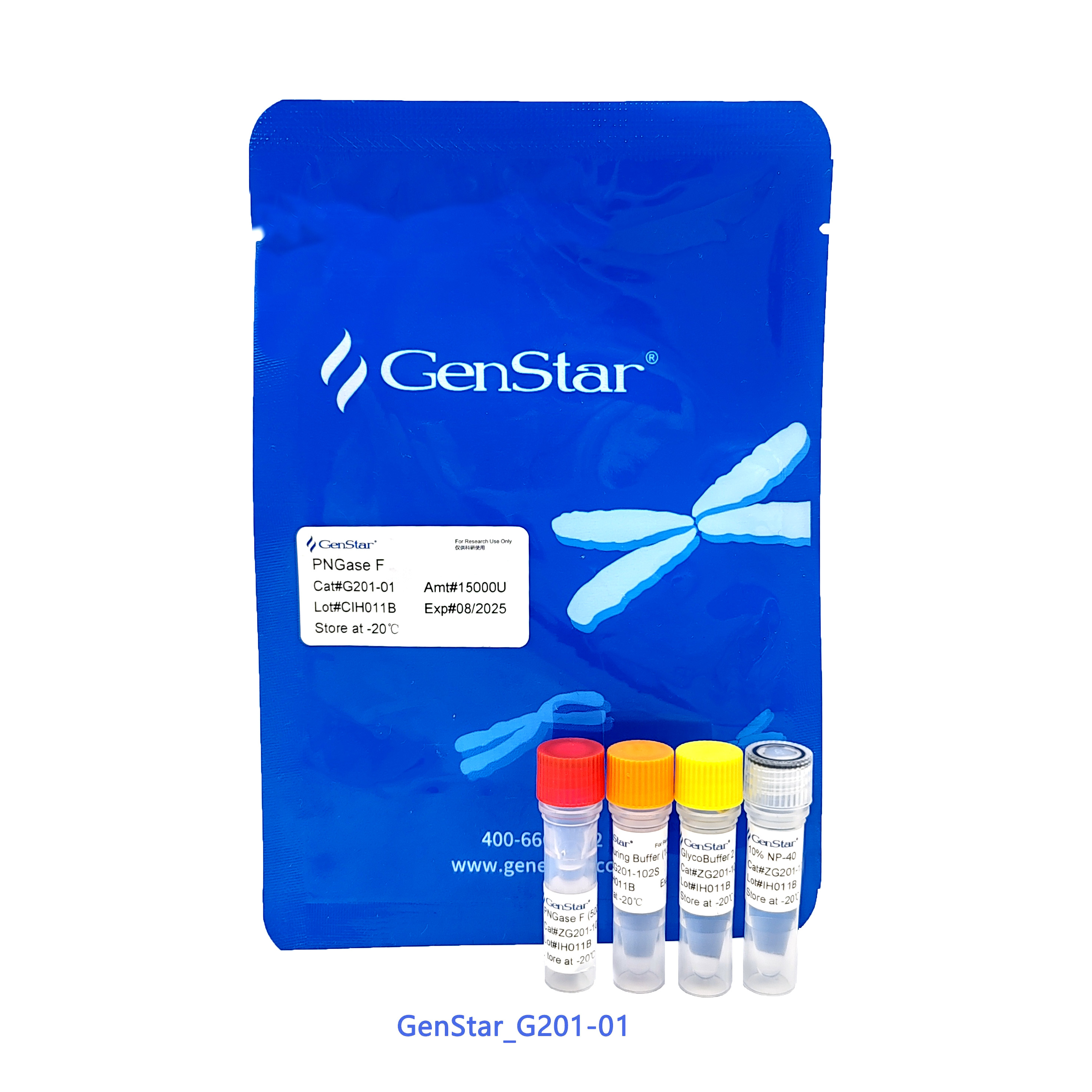 肽N-糖苷酶 F(PNGase F)是一種酰胺水解酶,克隆自和平空間站伊麗莎菌(Elizabethkingia miricola, formerly Flavobacteriummeningosepticum),在大腸桿菌中重組表達。PNGase F 可以裂解由天冬酰胺連接的高甘露糖,及雜合和復雜的寡糖糖蛋白。PNGase F 切割位點為糖蛋白內側 N-乙酰葡萄糖胺(GlcNAc)和天冬酰氨殘基之間的酰胺鍵,同時將酶解后蛋白上的天冬氨酰轉化為天冬氨酸,而不會去除常見植物糖蛋白上含有核心 α-(1,3)-巖藻糖 連接的寡糖。本產品常應用于抗體及其相關蛋白完全去糖基化。