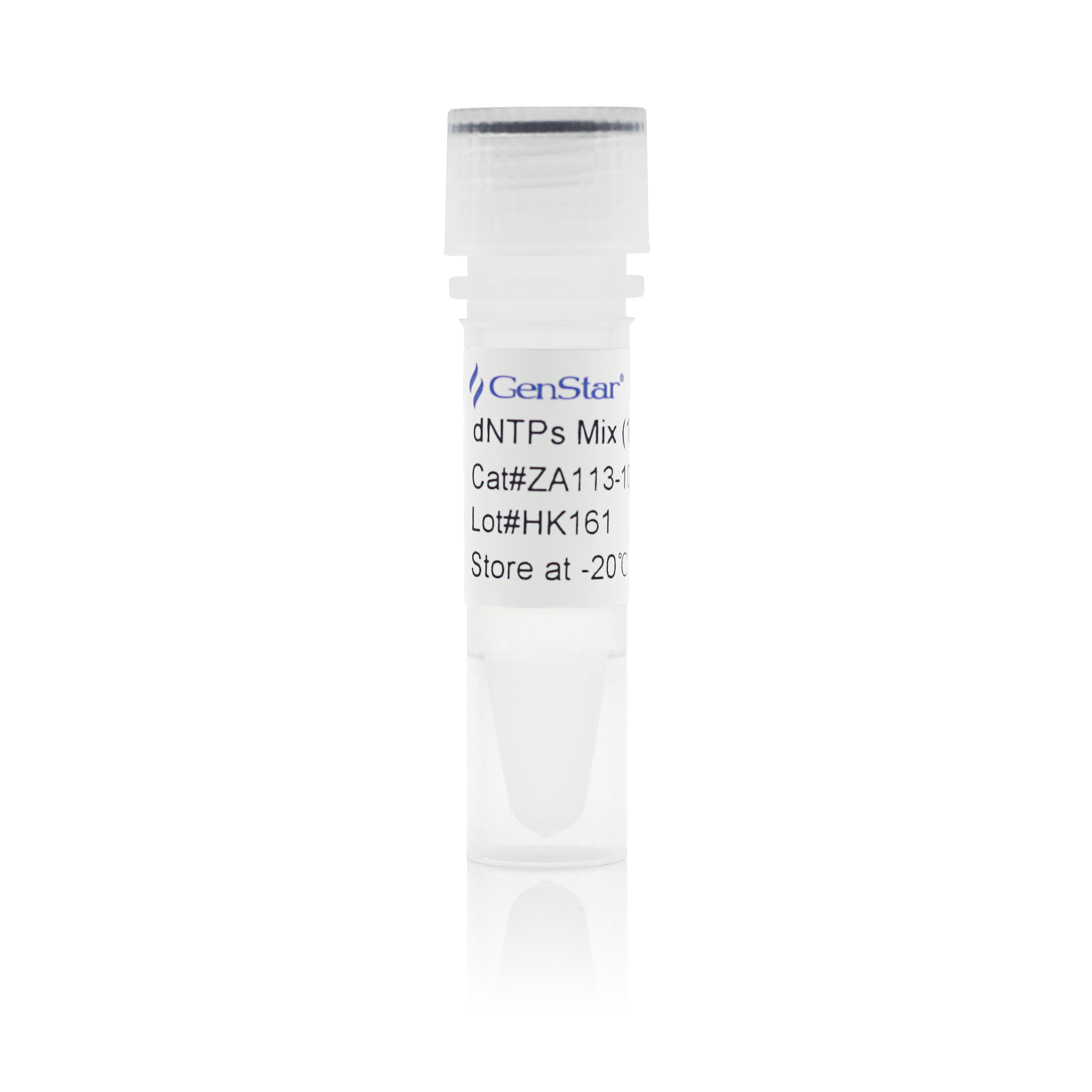 本品由等摩爾數(shù)的 dATP、dTTP、dGTP 和 dCTP 混合而成,適用于作為 PCR 反應(yīng)和反轉(zhuǎn)錄反應(yīng)的底物,或其它 DNA 聚合酶的底物。每種 dNTP 的終濃度為 10 mM,純度 ≥98%。經(jīng)檢測(cè)無(wú) DNA 酶、RNA 酶和磷酸酶污染。
