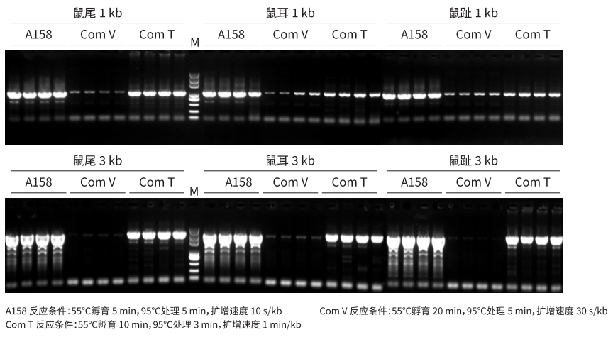 以鼠尾、鼠耳、鼠趾裂解液為模板,分別使用 A158、Com V、Com T 進行擴增。結(jié)果顯示,A158 較 Com V、Com T 裂解速度和擴增速度更快,擴增效率更高