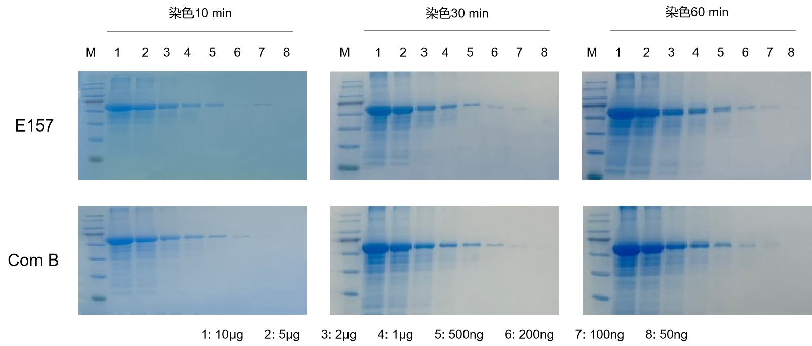 不同蛋白上樣量,經不同時間染色及脫色后,可看到清晰的目標蛋白條帶。結果顯示,E157 在 10 min 時可見 200 ng 條帶,30 min可見 100 ng 條帶,60 min 可見低至50 ng條帶,因此,E157染色速度快、靈敏度高。