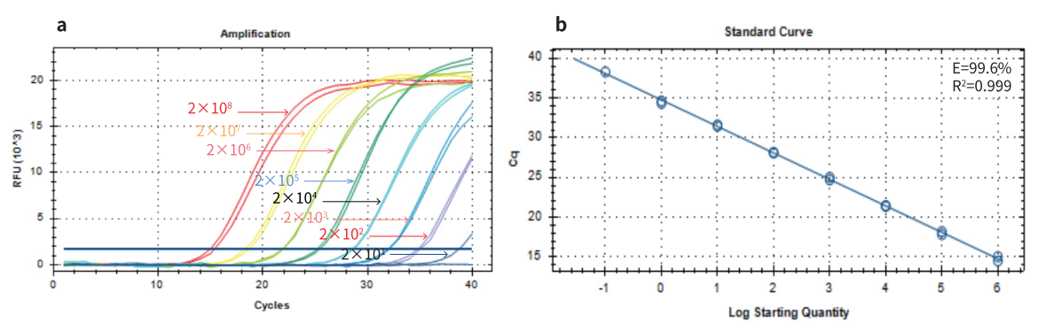 對濃度范圍為 2×101~2×108 copies/μl 的某 DNA 病毒陽性質(zhì)粒,用 GenStar #A392 進行 qPCR 檢測,結(jié)果顯示,GenStar #A392 可檢測出最低 DNA 量為 20 copies/μl。