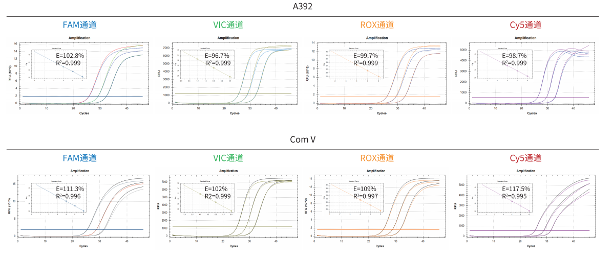 GenStar #A392 與 Com V 同時進行四重 qPCR 檢測,結(jié)果顯示,四通道檢測結(jié)果均良好,尤其 FAM、Cy5、ROX 通道擴增效率優(yōu)于 Com V。