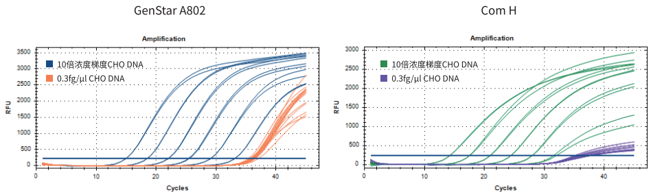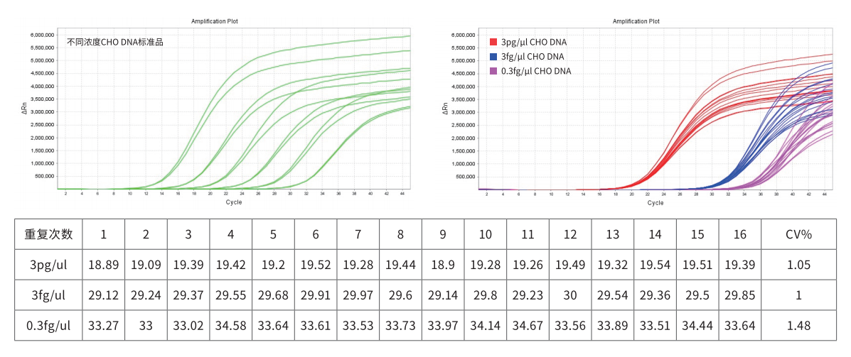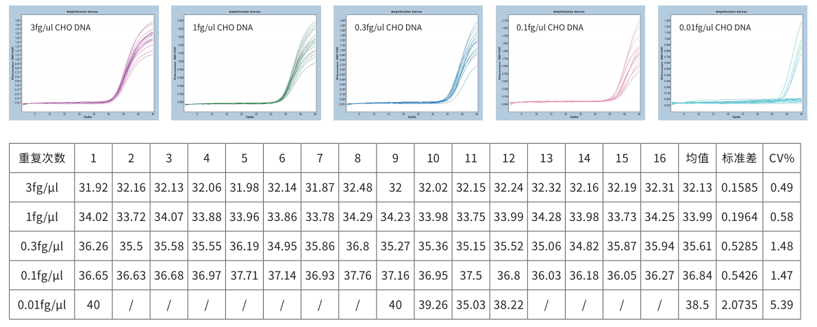 重復(fù) 16 次檢測 3 pg/μl、3 fg/μl 和 0.3 fg/μl 的CHO DNA,Ct 值 CV<5%,結(jié)果顯示 GenStar #A802 重復(fù)性好。
