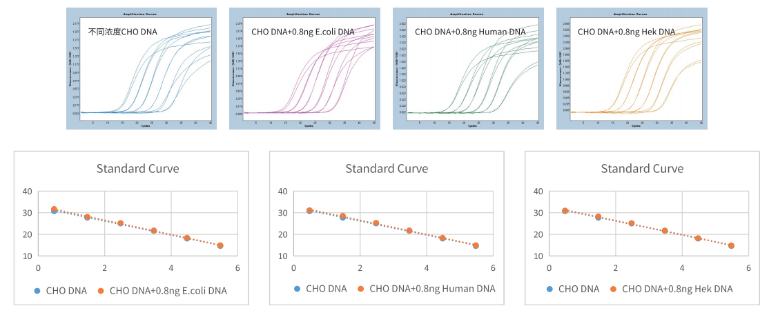 在不同濃度 CHO DNA 中分別加入 0.8 ng E.coli、Human、Hek 干擾 DNA,干擾組與對照組基本重合,未見干擾??梢?GenStar #A802 特異性很強(qiáng),不同細(xì)胞系間無交叉反應(yīng),結(jié)果更準(zhǔn)確。