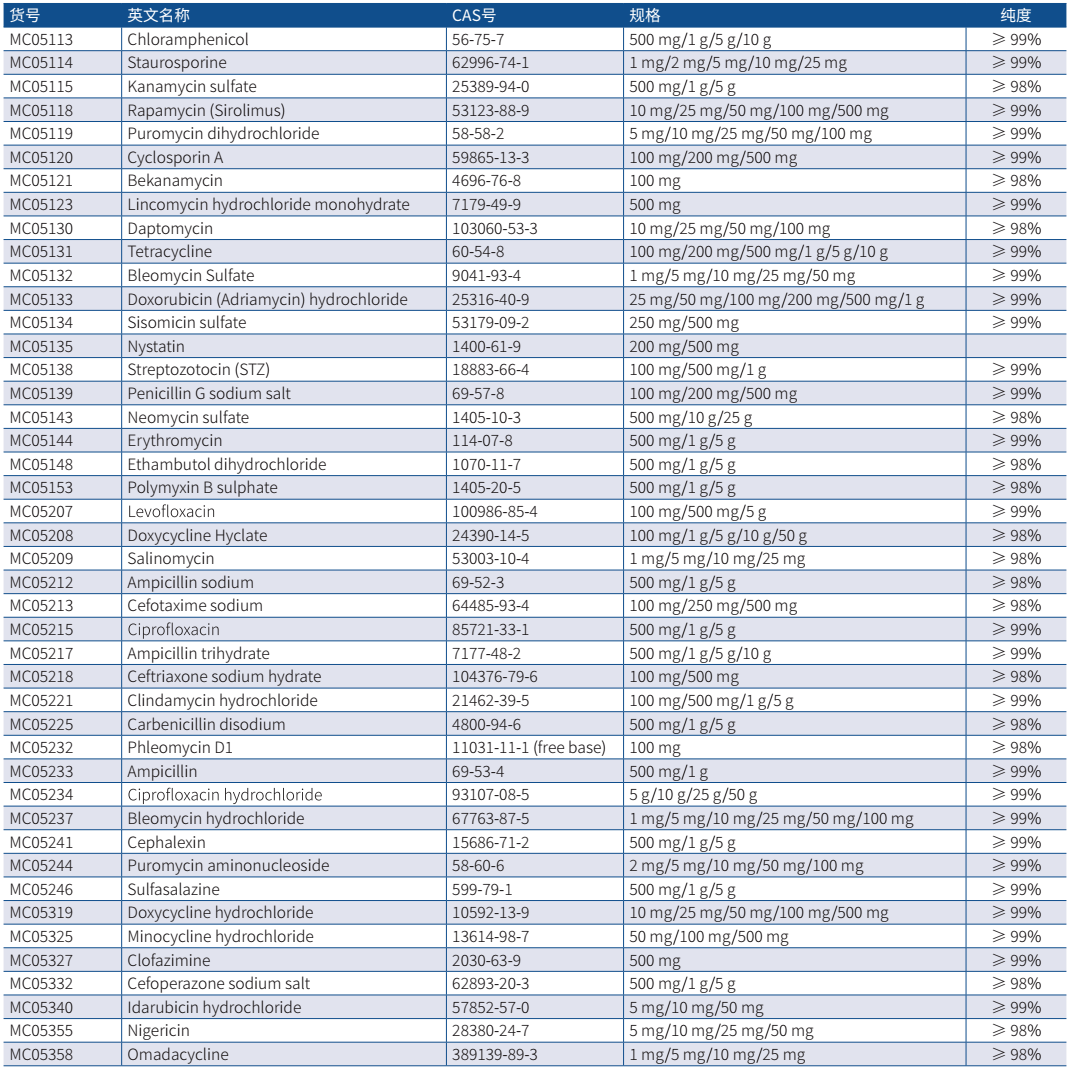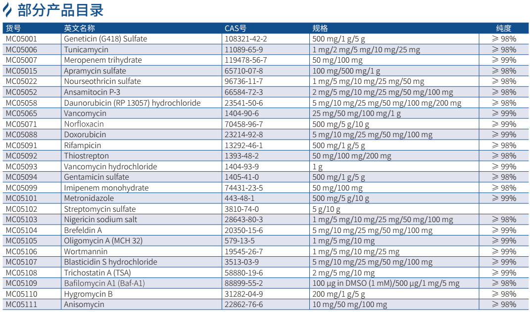 抗生素,主要是由細(xì)菌、霉菌或其他微生物產(chǎn)生的次級(jí)代謝產(chǎn)物或人工合成的類似物。通常可以理解為能夠殺死細(xì)菌或抑制其生長(zhǎng)的試劑,主要用于治療各種細(xì)菌感染或致病微生物感染類疾病,一般情況下對(duì)其宿主不會(huì)產(chǎn)生嚴(yán)重的副作用。GenStar 目前可提供多種抗生素用于科學(xué)研究,充分滿足您的實(shí)驗(yàn)需求,為您的實(shí)驗(yàn)保駕護(hù)航。