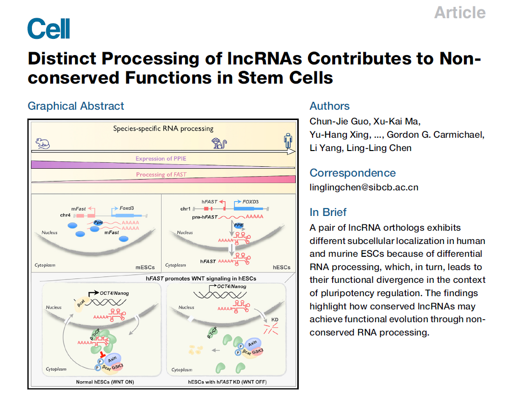2020年4月6月,中國(guó)科學(xué)院分子細(xì)胞科學(xué)卓越創(chuàng)新中心(生物化學(xué)與細(xì)胞生物學(xué)研究所)陳玲玲研究組在國(guó)際知名雜志Cell在線發(fā)表了一篇題為’’Distinct processing of lncRNAs contributes to non-conserved functions in stem cells”的研究論文。