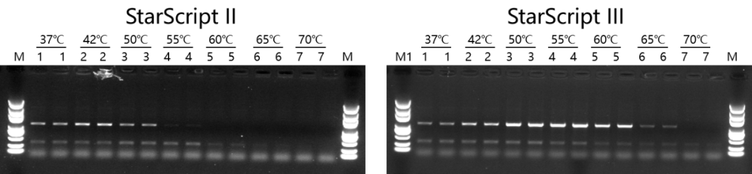 StarScript II最佳反應(yīng)溫度為42℃,耐受50℃;StarScript III最佳反應(yīng)溫度50-55℃,耐受65℃。